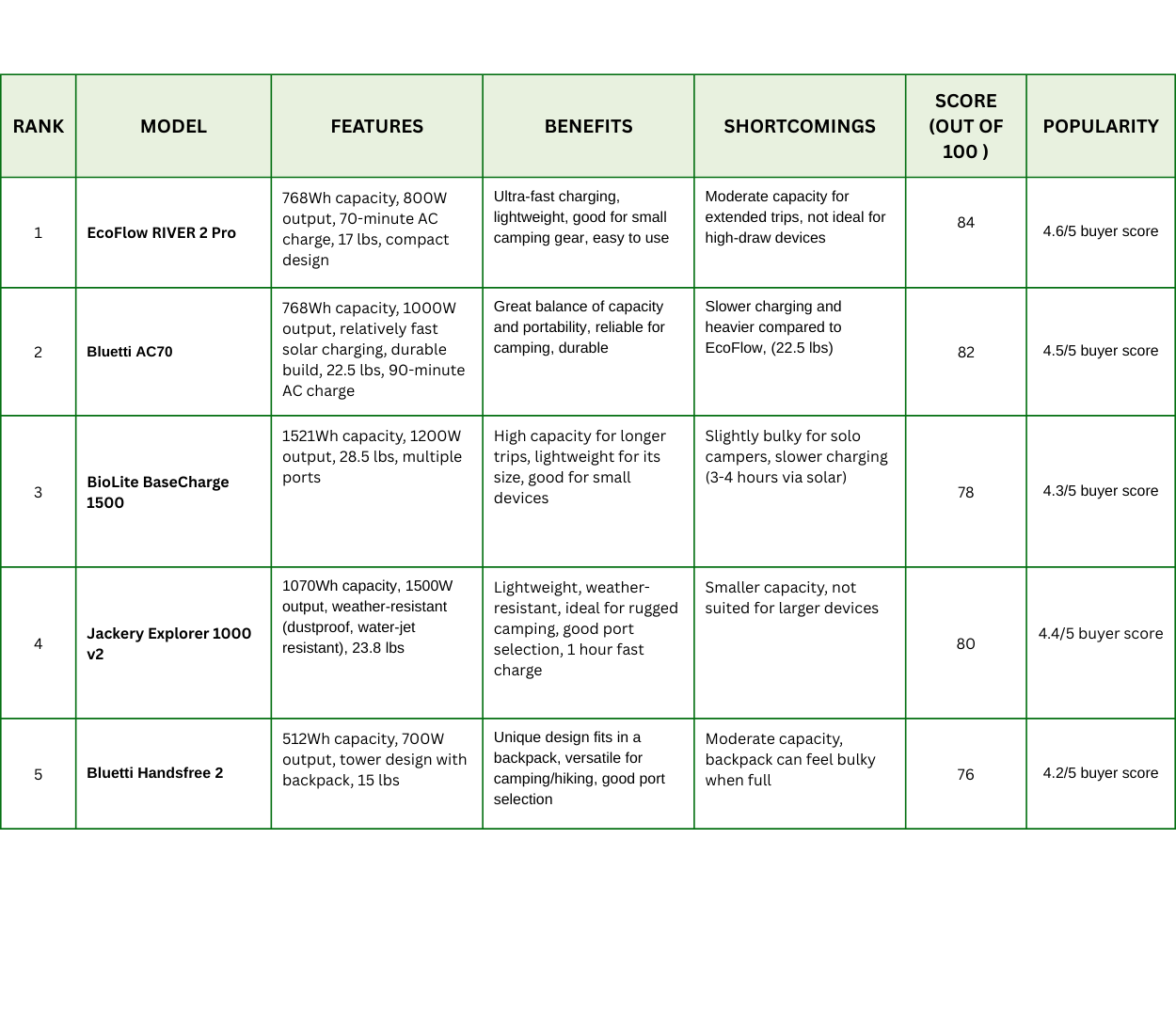 The EcoFlow RIVER 2 Pro was chosen as the winner, scoring 84/100, with a 768Wh capacity, 800W output, and a lightweight 17-lb design. Its ultra-fast 70-minute AC charge and compact size, paired with an average 4.6/5 buyer score, made it ideal for campers needing reliable, portable power, as reflected in comments like “Lightweight and fast charge, perfect for camping.”