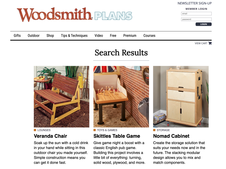 • Variety with curation: 800+ plans available across furniture, jigs, shop storage, and decorative items—with filters to find what you need.
